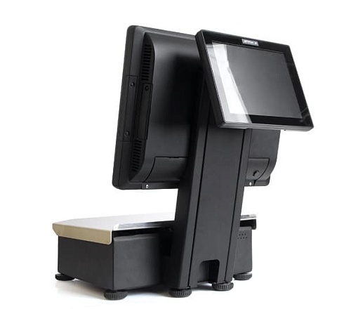Весы самообслуживания с дополнительным экраном который может быть использован для рекламных роликов или отображения информации для покупателей. На весах установлен сенсорный моноблок 15" от компании Flytech - известного производителя POS - терминалов.