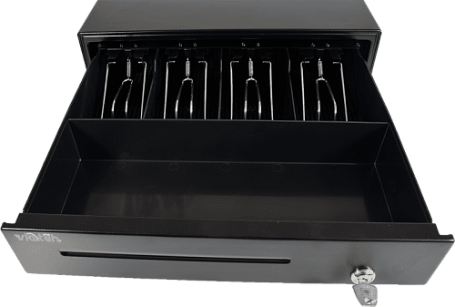 Простой бюджетный механический денежный ящик Vioteh HVC-09 черного цвета без автоматического замка. Имеется 4 отсека с прижимными клипсами для купюр и 8 для монет. Так же есть скрытый отсек. Денежный ящик предназначен для хранения денежной наличности при расчетах с населением с применением контрольно-кассовой техники (ККТ). Денежный ящик может использоваться без ограничения любым типом ККТ от автономных касс до фискальных регистраторов.
