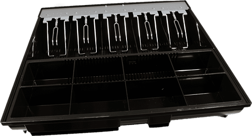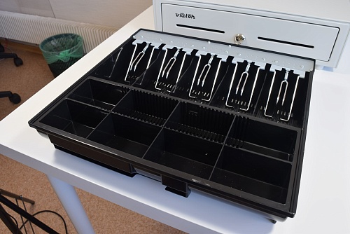Электромеханический денежный ящик Vioteh HVC-16 белого цвета с интерфейсом RJ12. Имеется 5 отсеков с прижимными клипсами для купюр и 8 для монет. Есть два скрытых отсека для крупных купюр или документов. Кассовый ящик с подключением к управляющему устройству типа кассовый аппарат или фискальный регистратор.